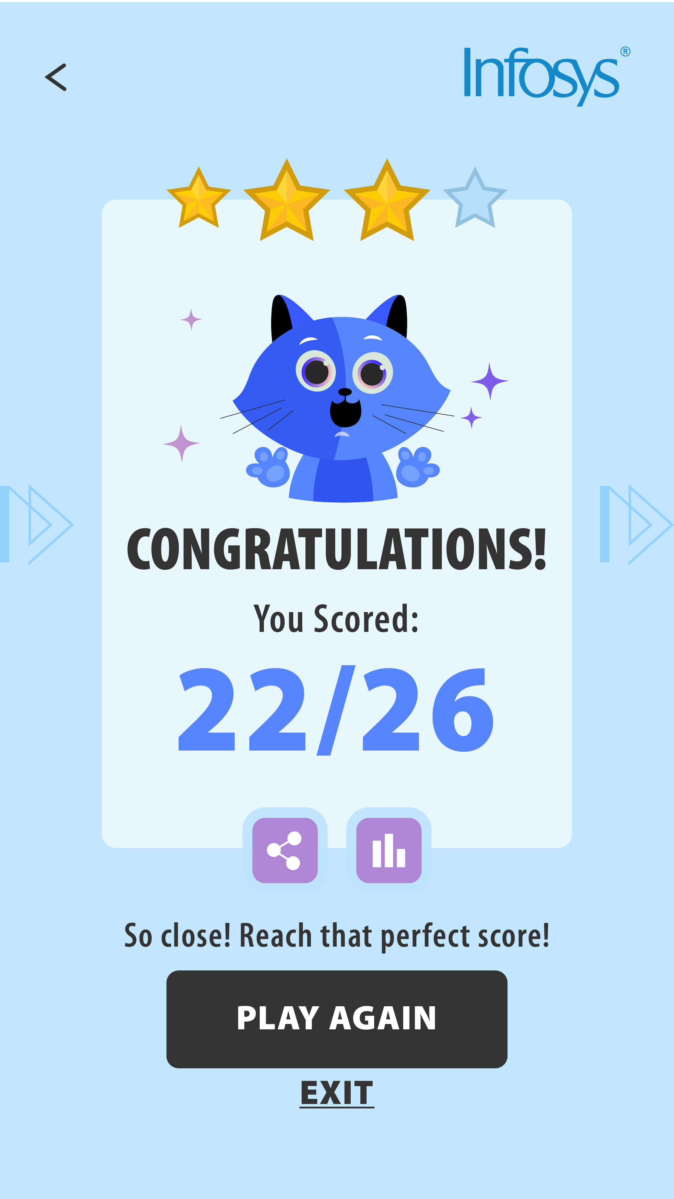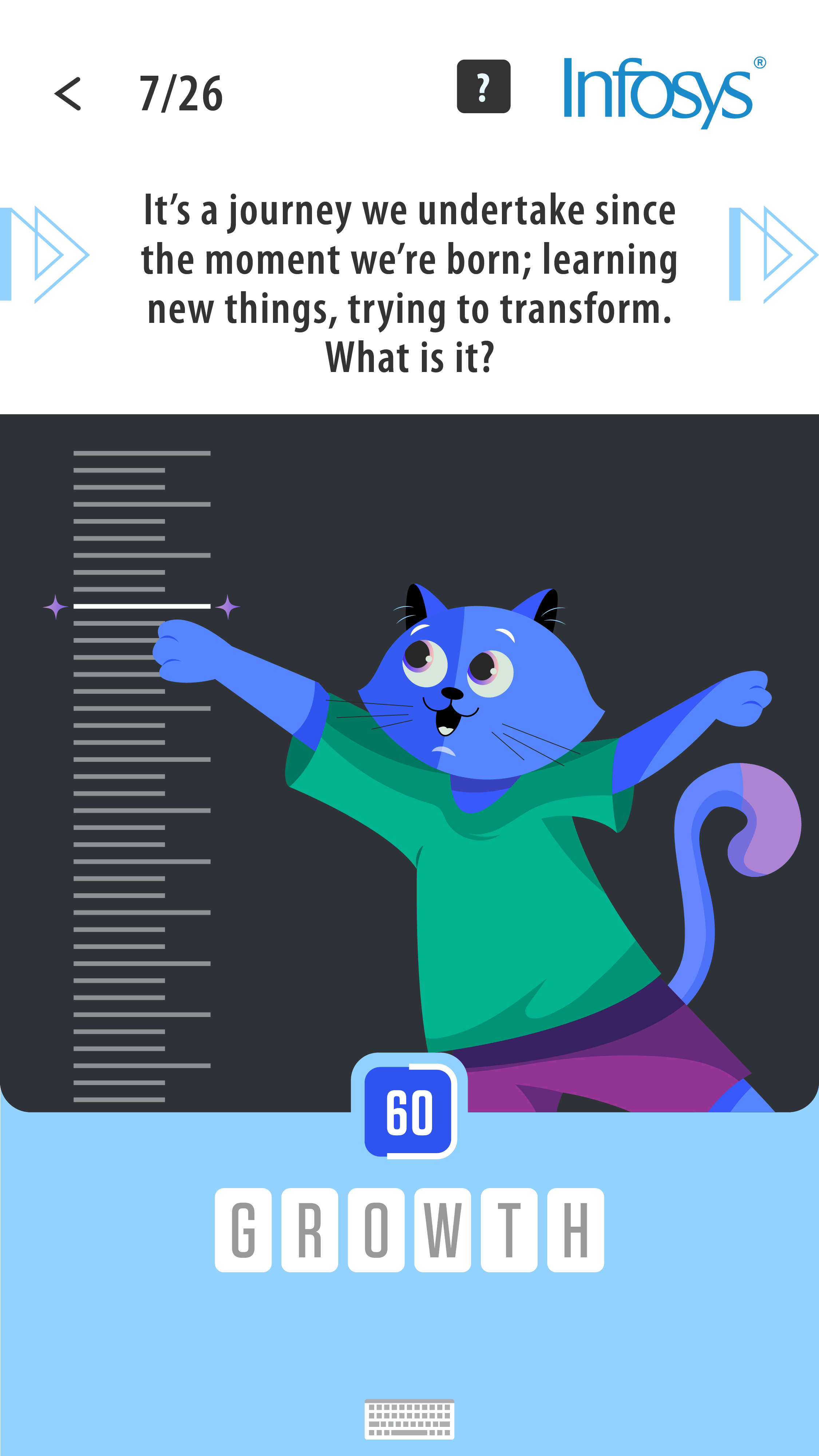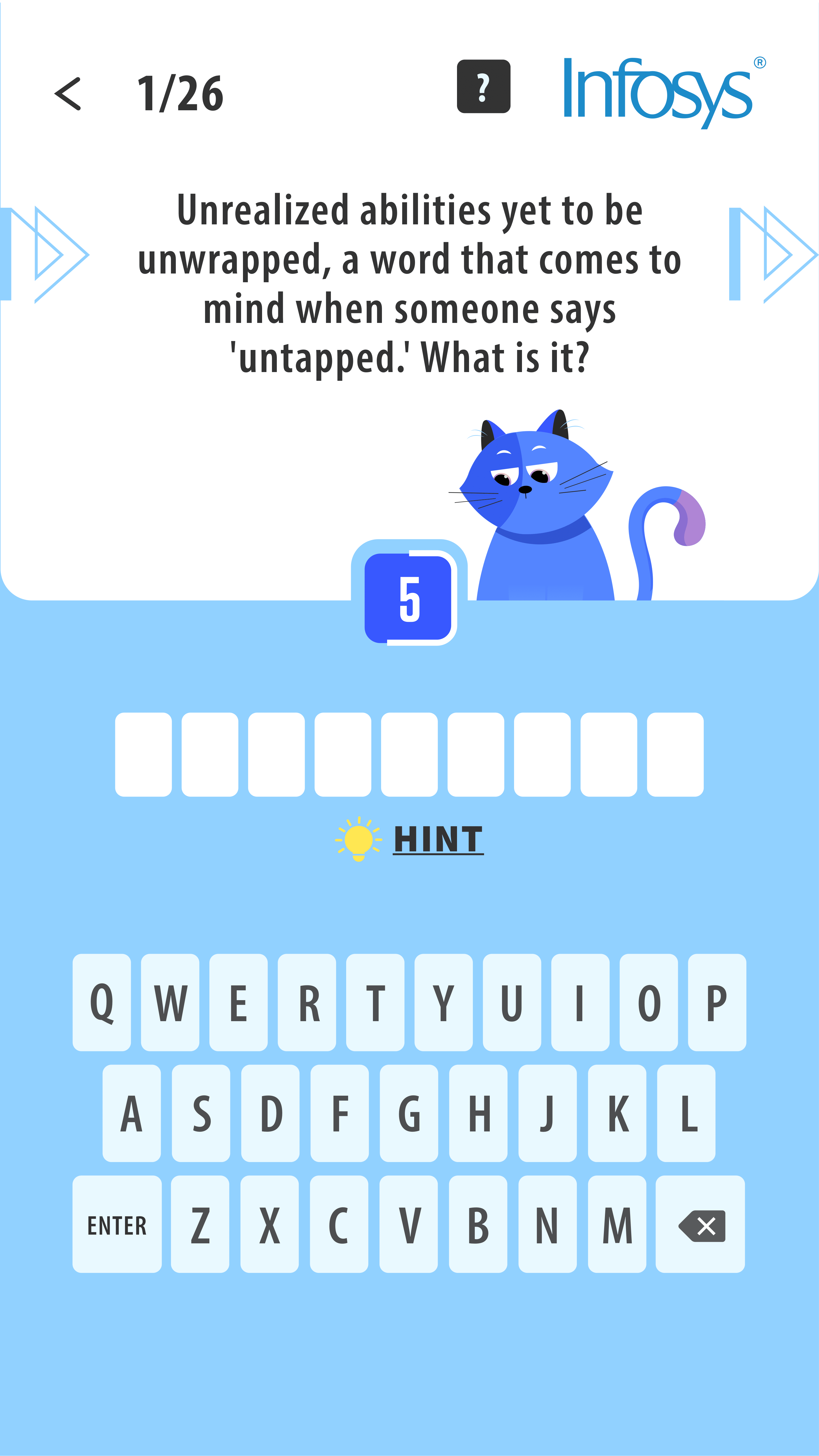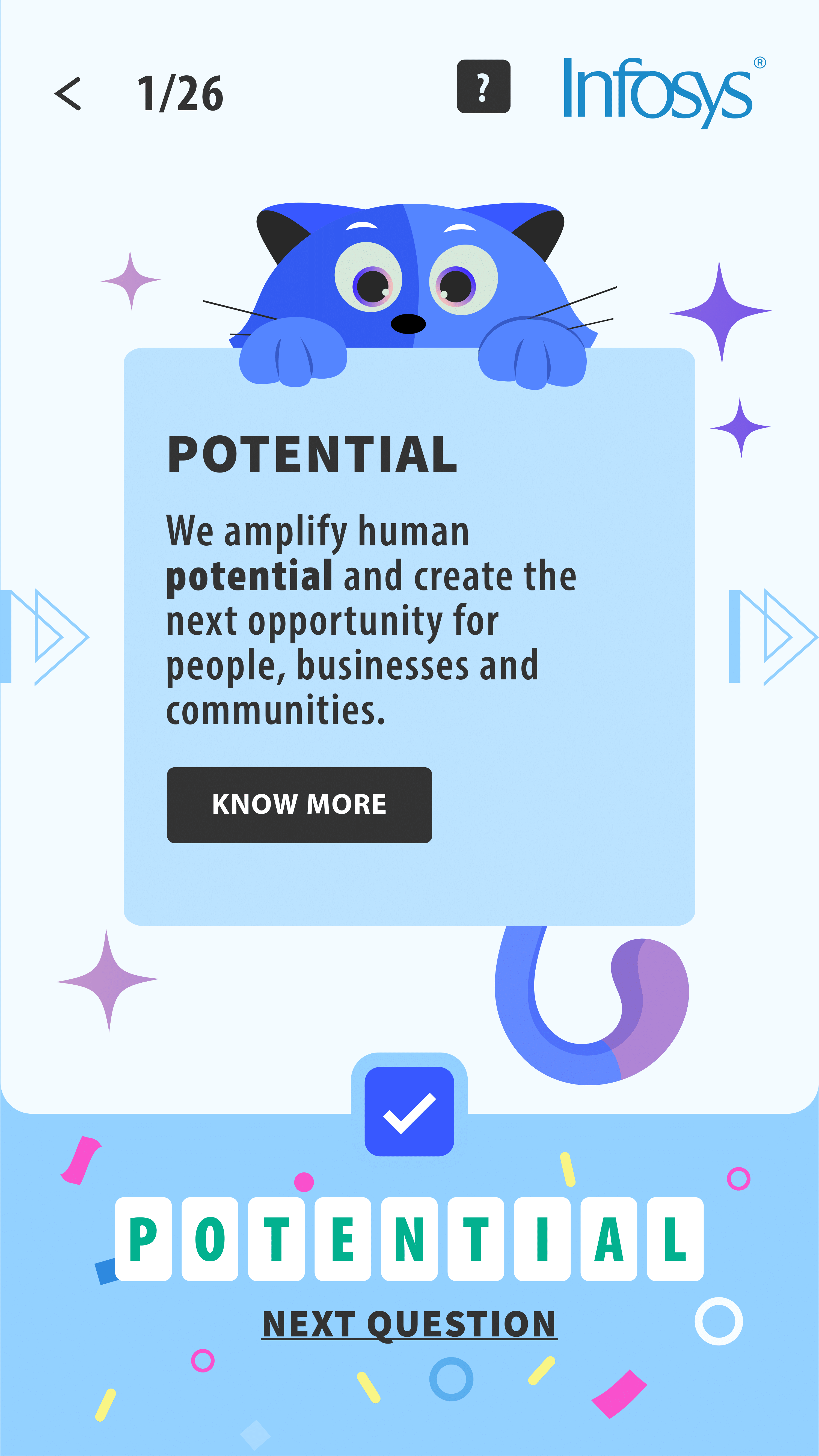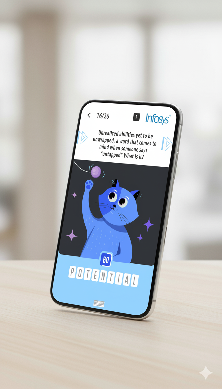 So we put the two together. The result? Code Cracker, a bite-sized, engaging word puzzle built around Infosys-centric clues. Each letter unlocked a value-driven word like ‘Opportunity’ or ‘Future-focused’, with our cat mascot dishing out playful hints and quirky trivia along the way.