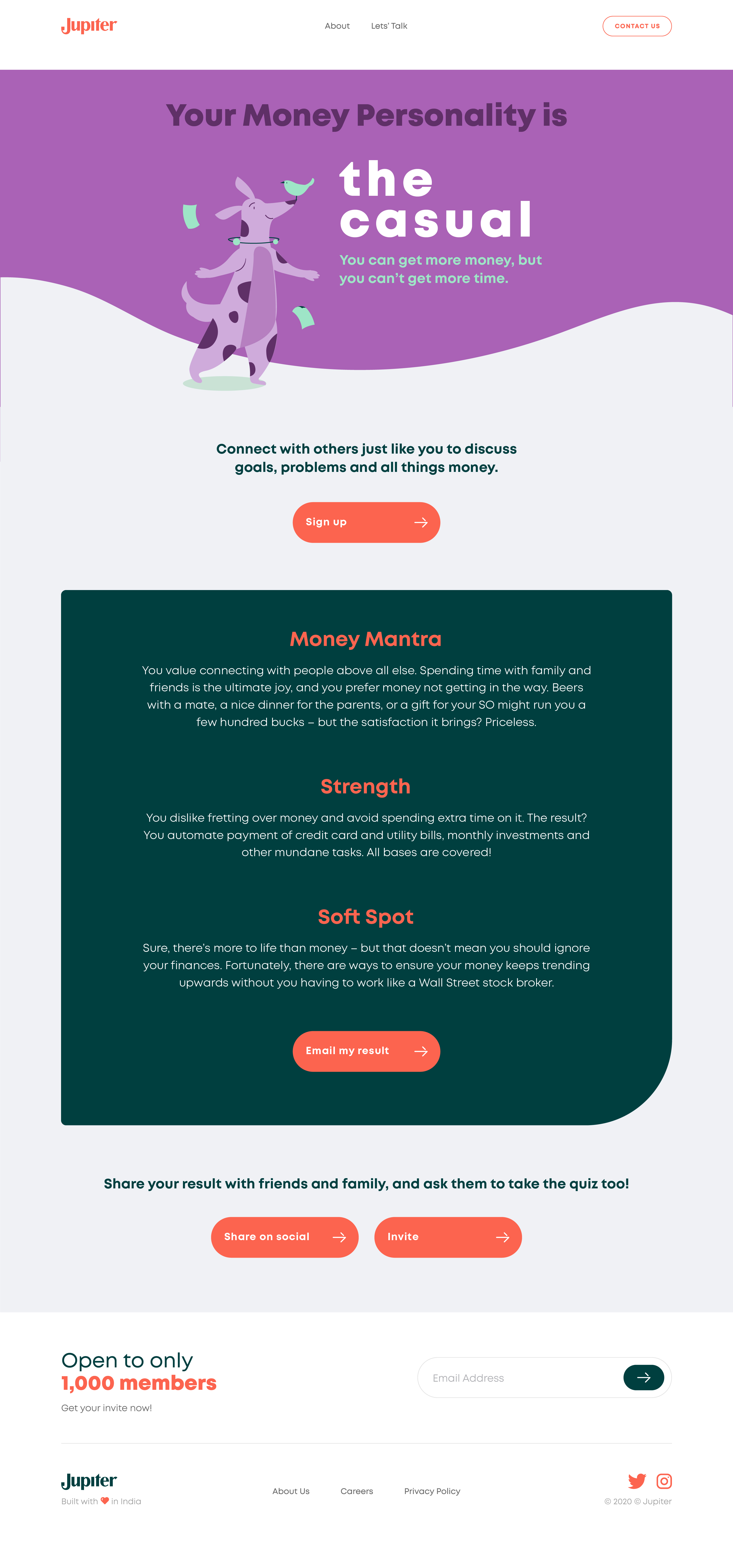 So we built the Jupiter Financial Personality Quiz. At the time, the Myers-Briggs Personality Test was still very popular. But wouldn’t it be great if the INTJs and ENTPs also knew what financial habits and traits were unique to them? Our quiz delivered just that. And in return, we not only received the insights we wanted, but also managed to build more hype for a bank that was really trying to do things differently.